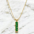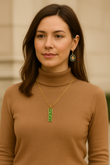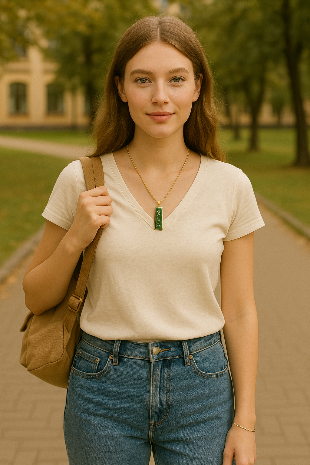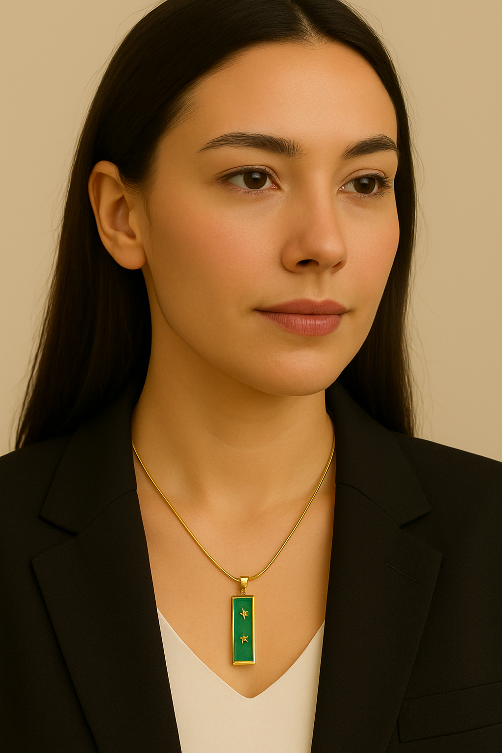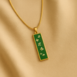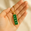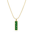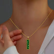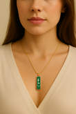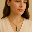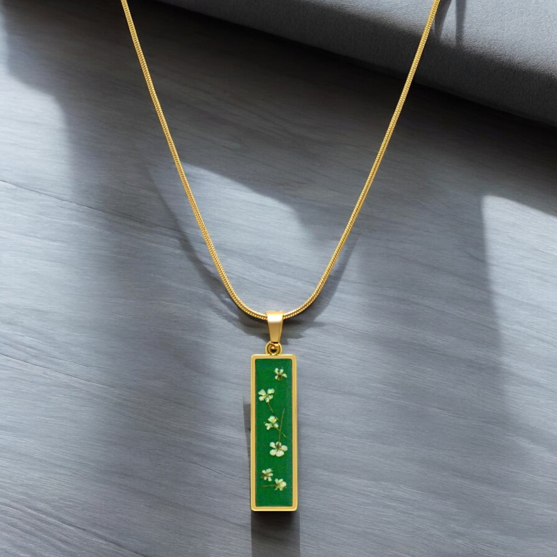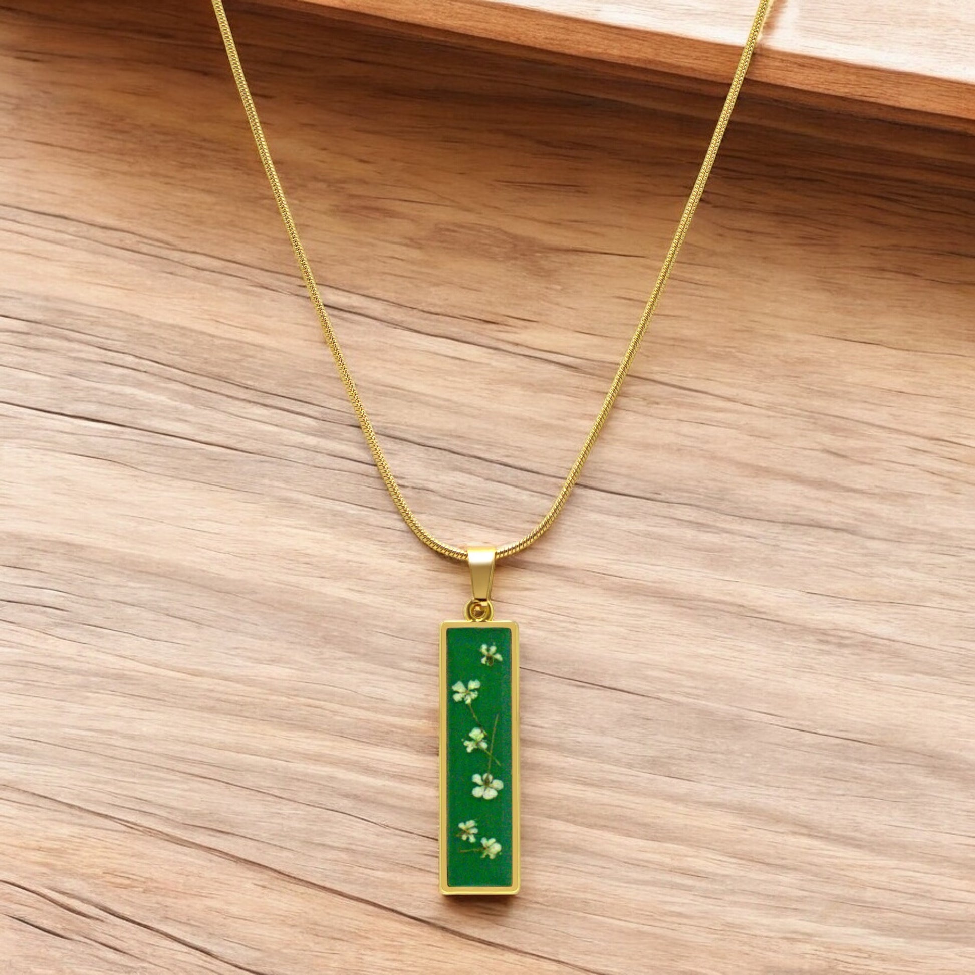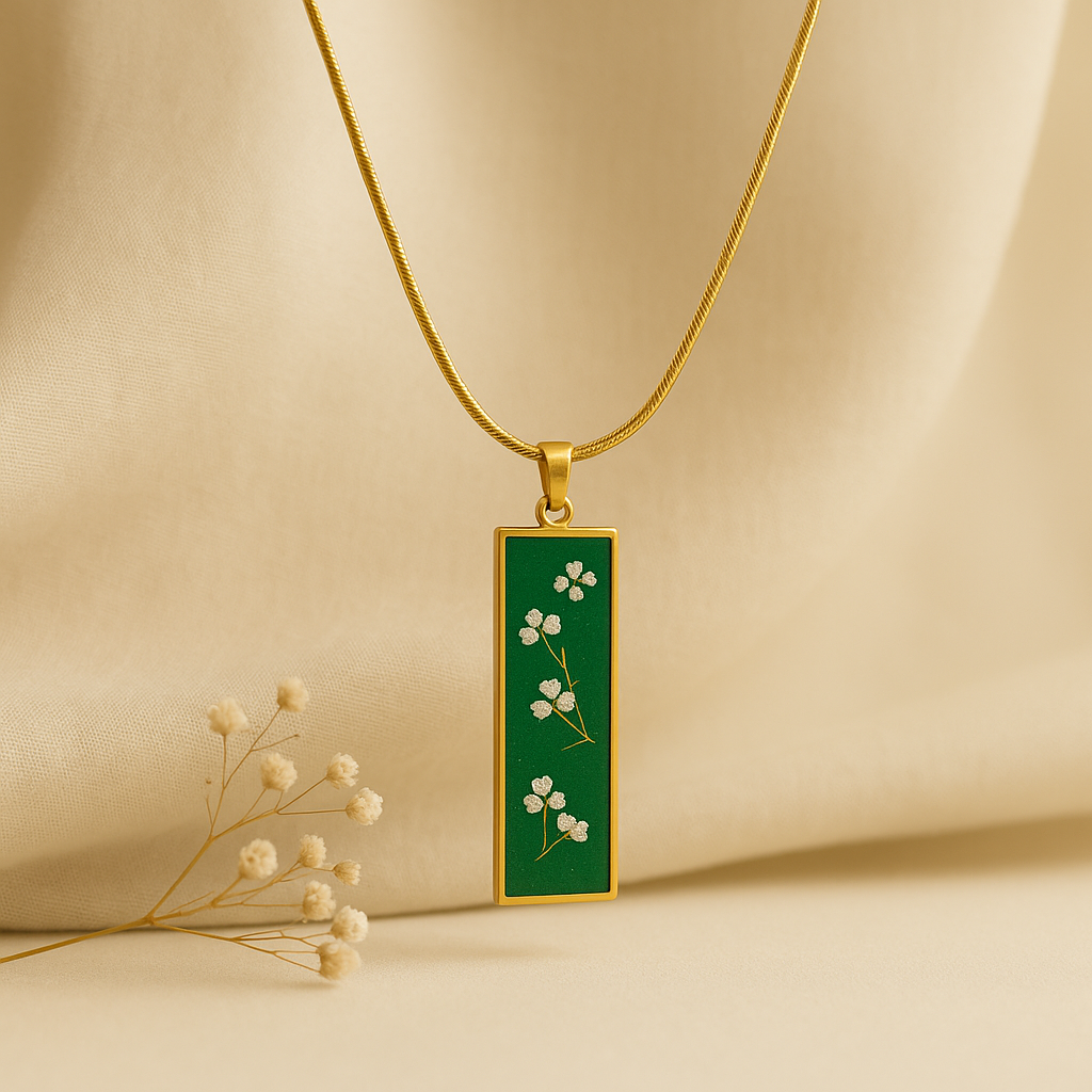 · Design: Rectangular pendant showcasing delicate natural florals in a rich green hue, complemented by a luxurious gold-plated frame.