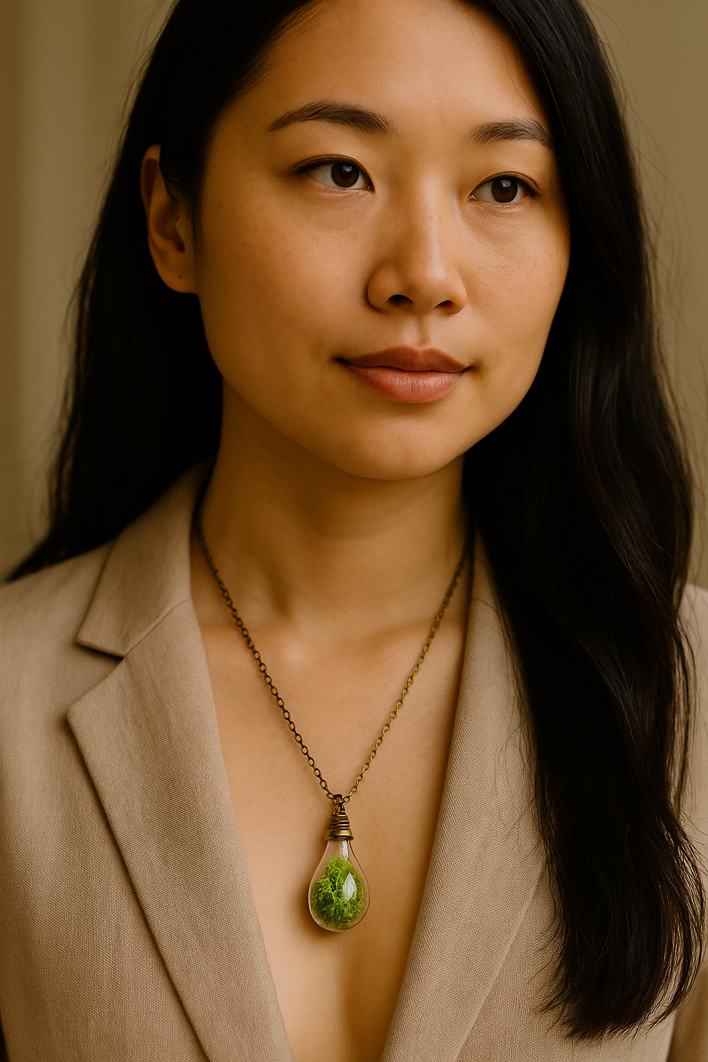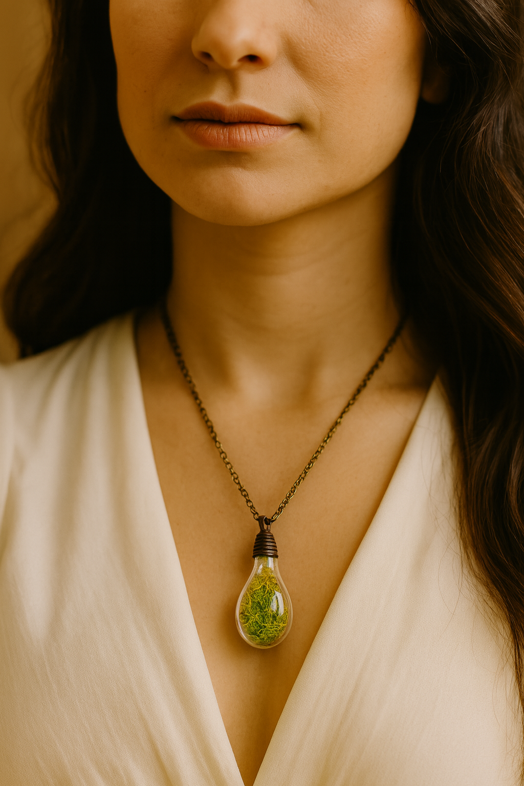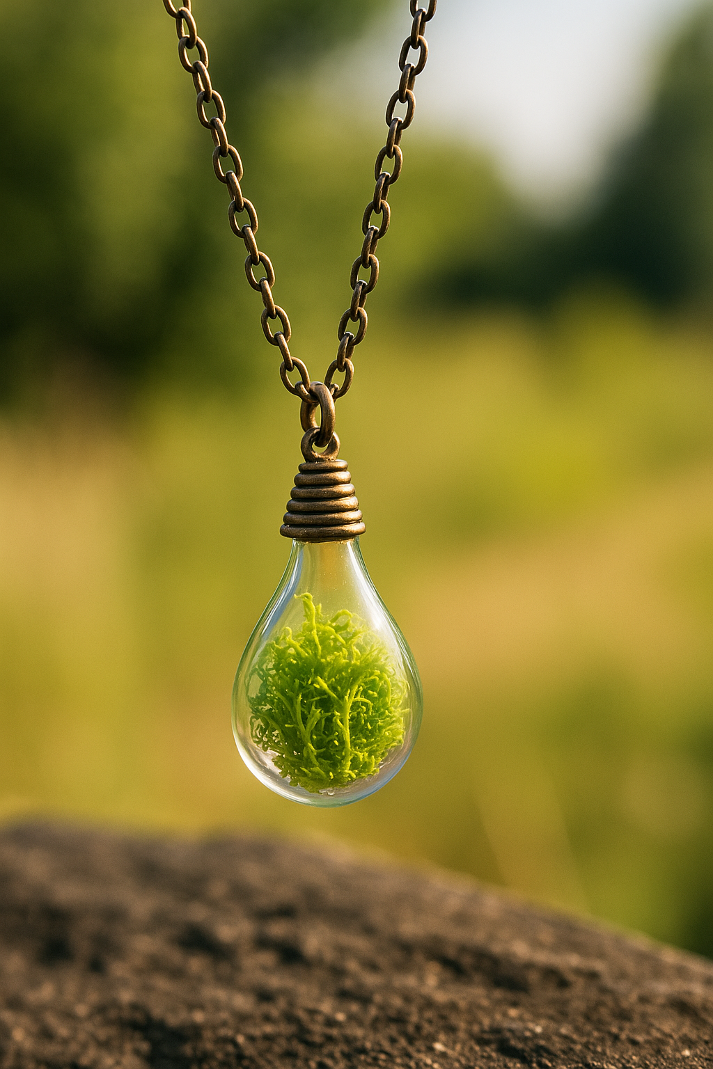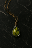 The Forest Glow Moss Pendant captures the essence of nature in its purest form — a vibrant green preserved moss encased within a clear, lightbulb-shaped glass pendant. Each piece is handmade, symbolizing renewal, grounding energy, and connection to the earth. The antique bronze chain complements its rustic charm, making it both a spiritual keepsake and a timeless fashion piece.
