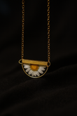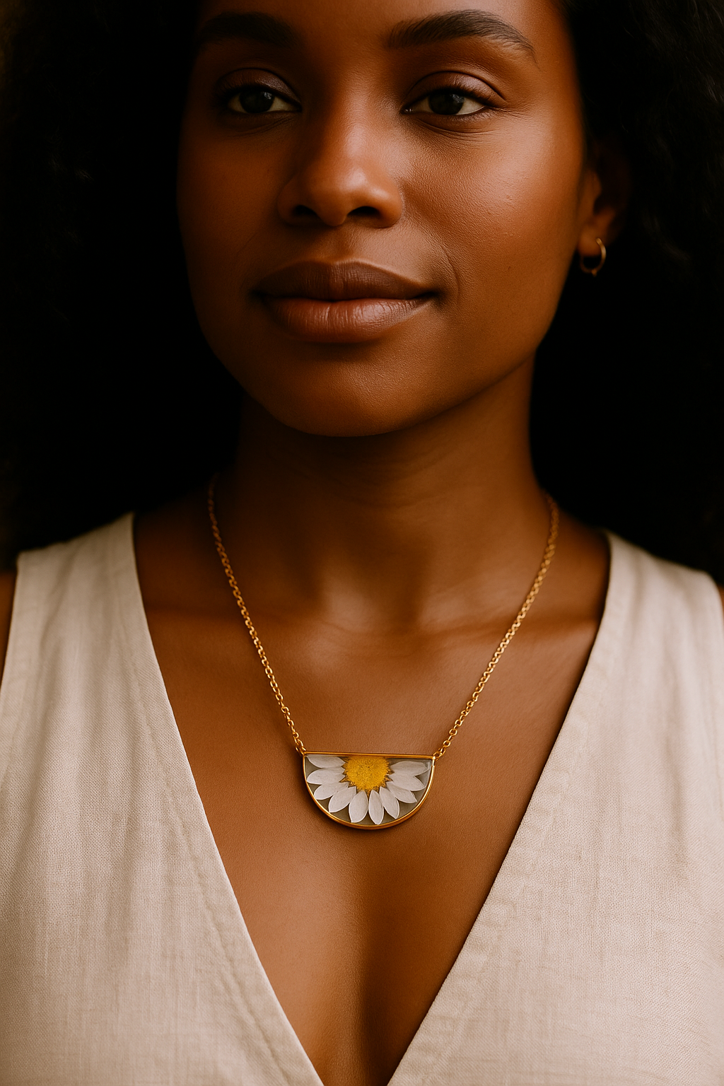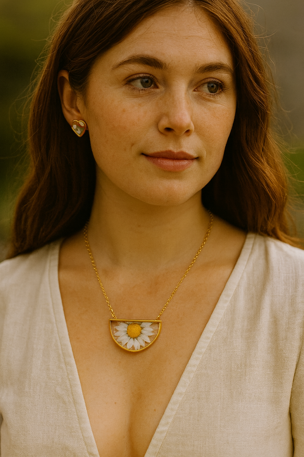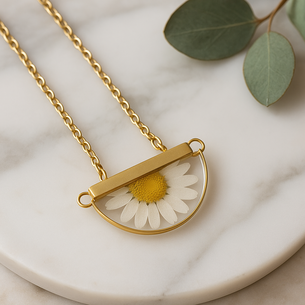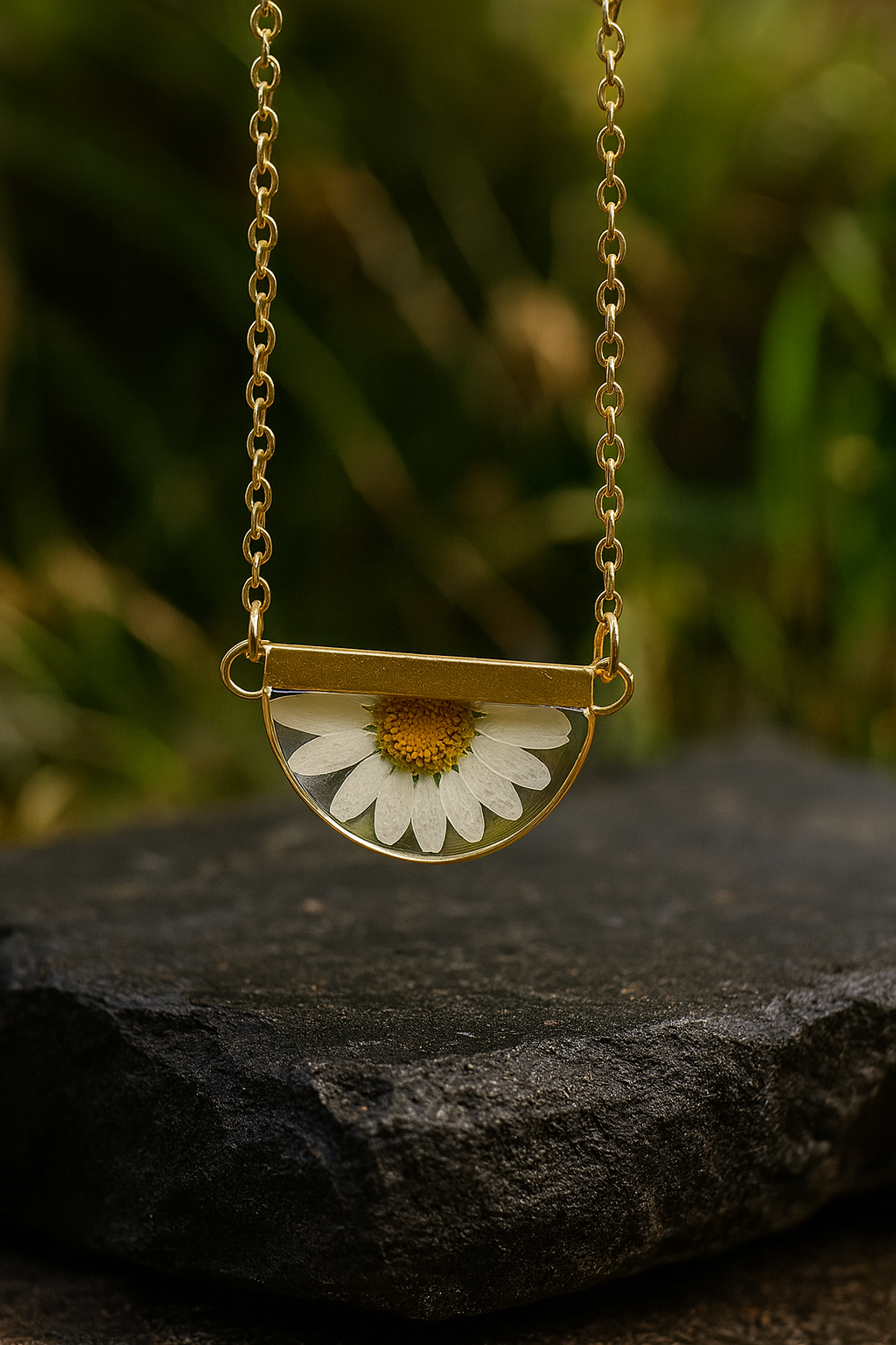 The Golden Daisy Glow Pendant celebrates the timeless beauty of the white daisy — a flower that symbolizes purity, optimism, and new beginnings. A real daisy bloom is carefully pressed and encased in clear, high-grade resin, then set in a lustrous half-moon gold frame. The pendant radiates warmth and joy, perfect for those who adore natural, minimalist elegance.