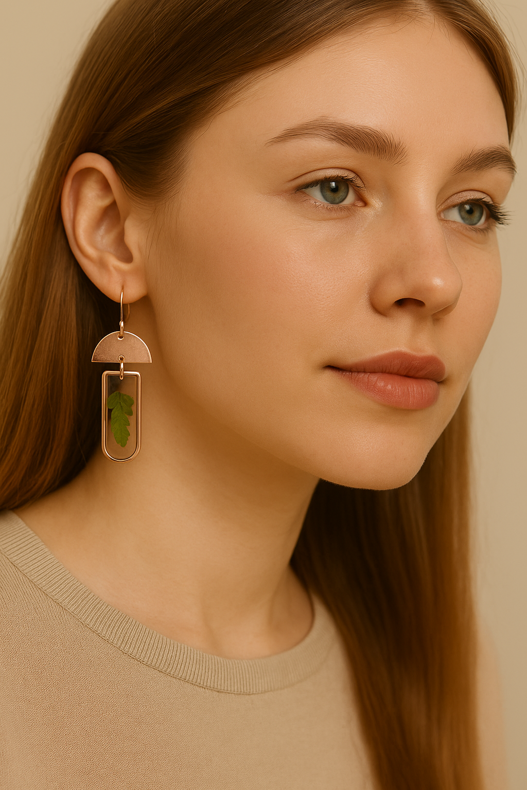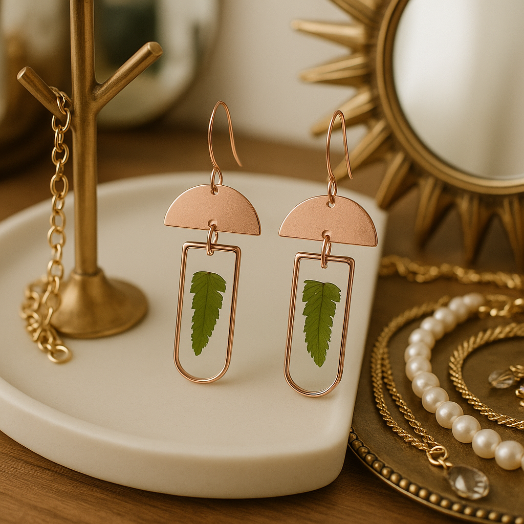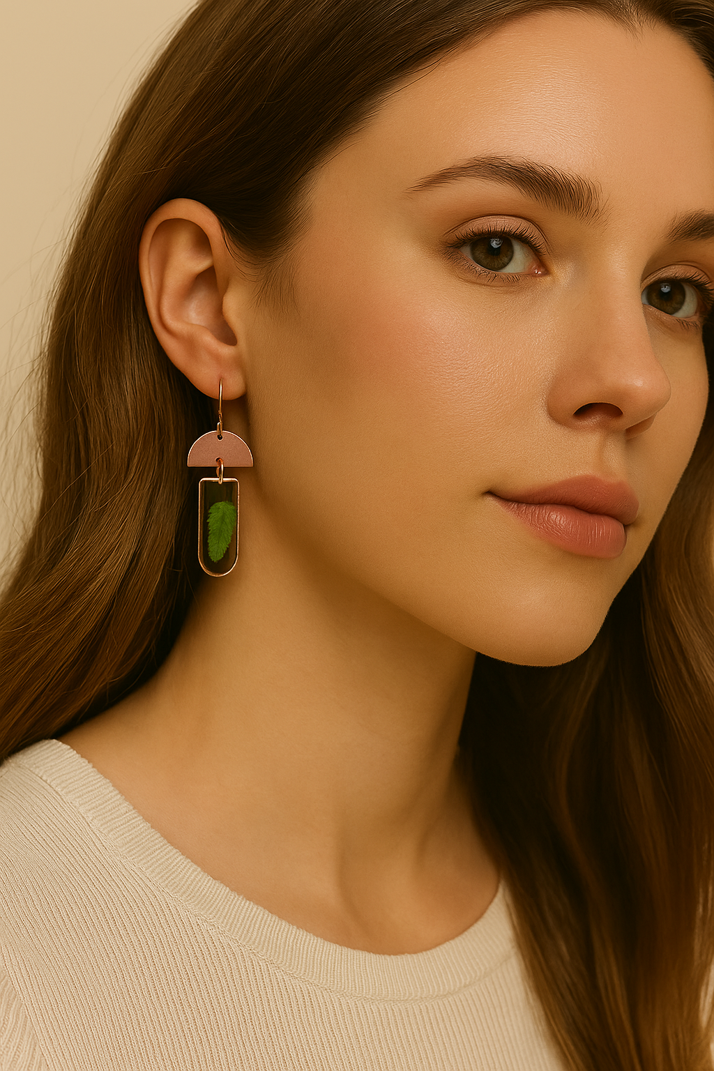 · Materials: Metal alloy frame in rose gold, resin, Pressed Fern leaf