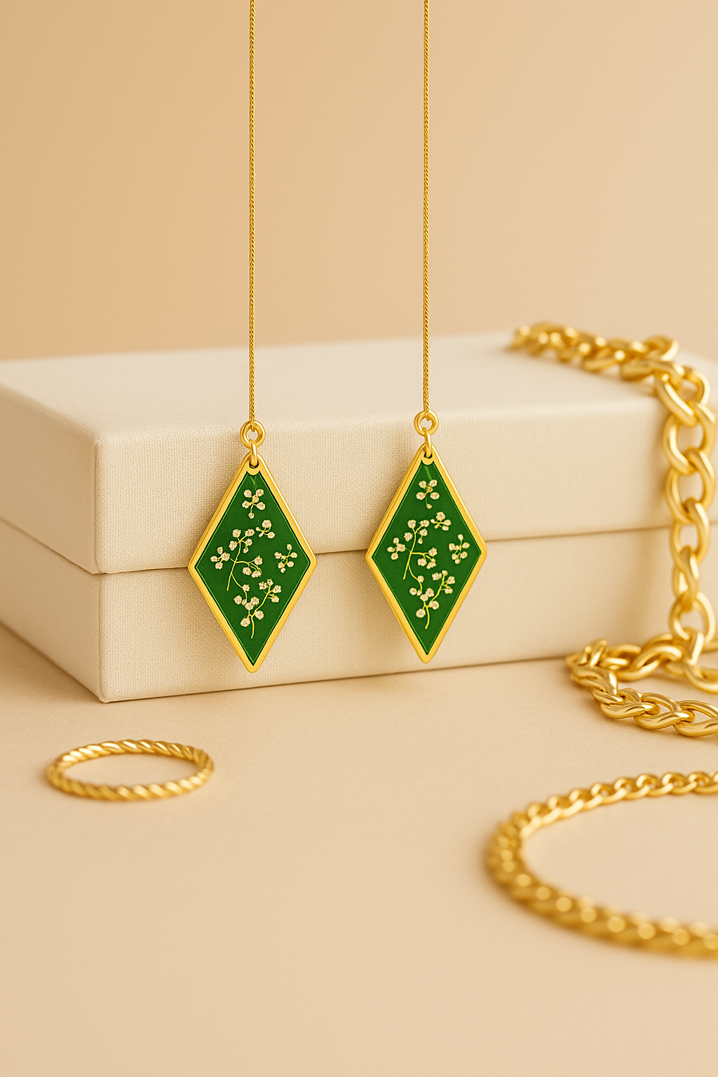 Resin is a somewhat pliable, easily scratchable, and chemically sensitive material compared to metals. To preserve your jewelry, avoid exposing it to water by not wearing it while showering or swimming, and refrain from applying perfume directly onto it.